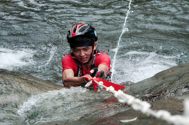 ? ? 40公里溯溪越野個(gè)人賽男子前三名分別為:王治虎(貴州,4小時(shí)05分54秒)、駱滔(貴州,4小時(shí)07分16秒)、岑萬(wàn)江(浙江,4小時(shí)10分16秒) 程斌 攝