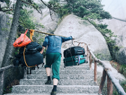 特色: 在天柱山上,經(jīng)常能碰到挑山工。他們肩上搭一根光溜溜的扁擔,兩頭垂下幾根繩子,掛著沉甸甸的物品。登山的時候,他們一只手搭在扁擔上,另一只手杵著大杵,保持身體平衡。他們的路線是折尺形的--先從臺階的左側(cè)起步,斜行向上,登上七八級臺階,就到了臺的右側(cè);便轉(zhuǎn)過身子,反方向斜行,到了左側(cè)再轉(zhuǎn)回來,每次轉(zhuǎn)身,扁擔換一次肩。他們這樣曲折向上登,才能使掛在扁擔前頭的東西不碰...